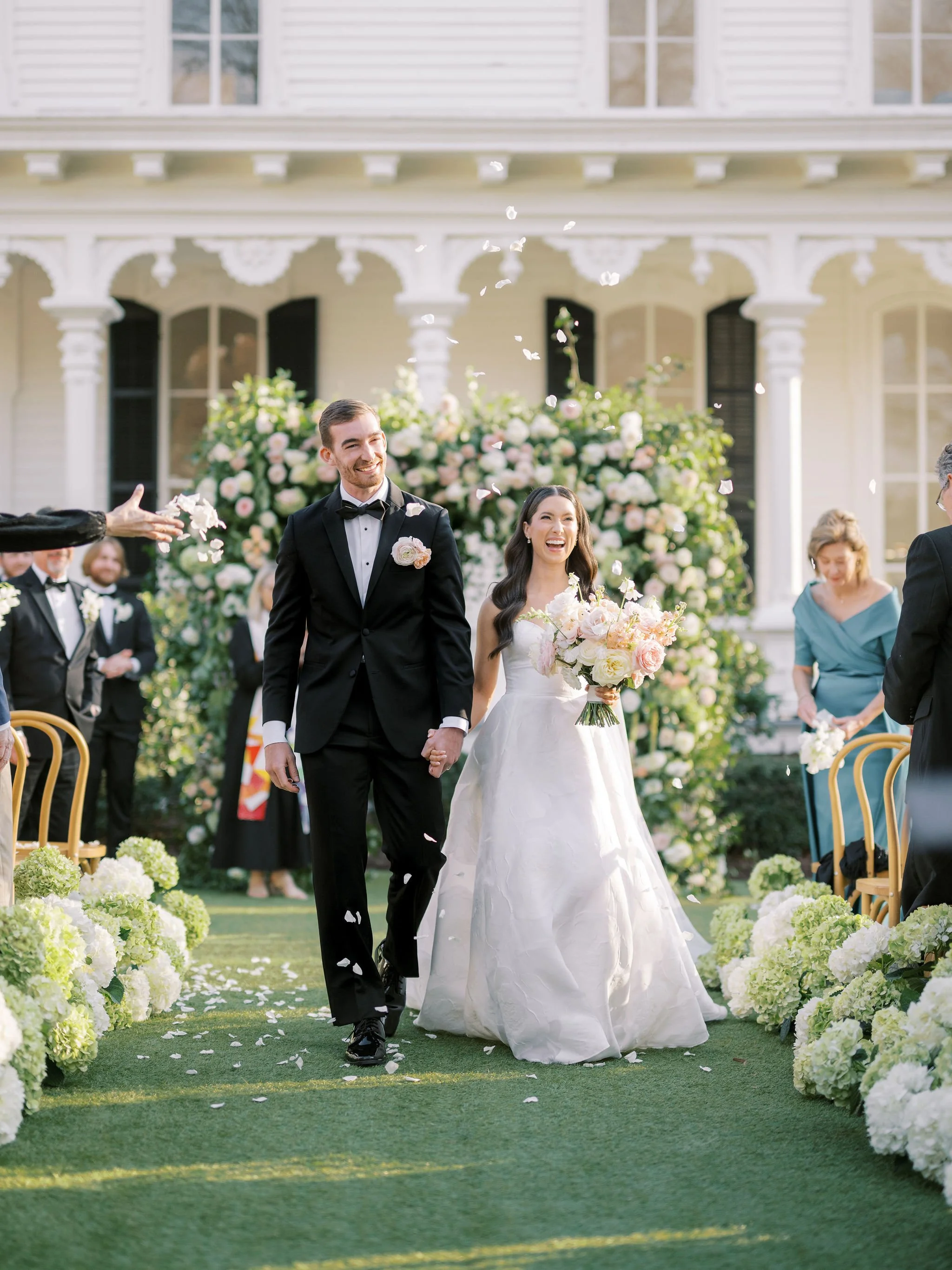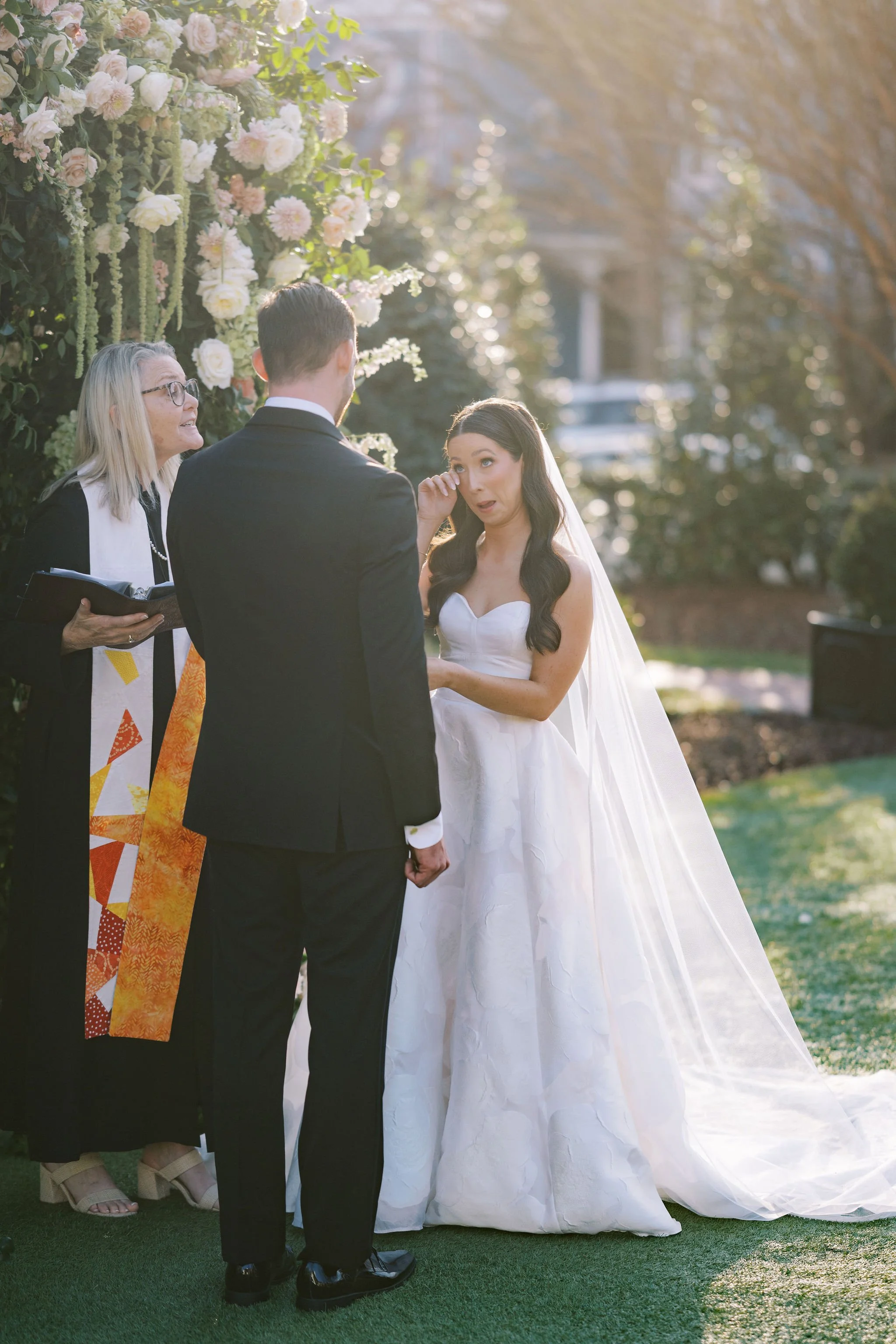 3.1.25 As a wedding officiant, I have the honor of witnessing love stories unfold in the most beautiful ways, and Charley and Eric’s wedding was no exception. Held on a picture-perfect 70-degree day, their celebration was filled with warmth, joy, and a stunning pink and green floral theme that created a dreamy atmosphere at the Merrimon-Wynne House.